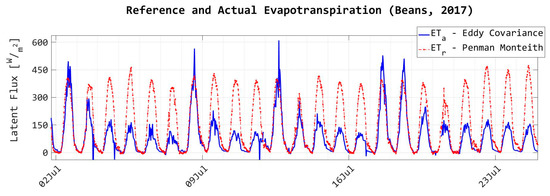 Direct measurement of actual ETa can be used to evaluate the effect of water availability on consumptive use. In the case of site 1, irrigation was adjusted throughout the season in an attempt to compensate for apparent water demand (based on the irrigators’ hand tests of soil moisture, crop development and in anticipation of weather forecasts). However, the irrigator expressed that lack of information on the actual water demand meant that these adjustments were largely subjective and led to inconsistent interannual yields and even crop failure in some years (personal communication). In the 2017 growing season, the field at site 1 was irrigated weekly at a 12 mm (1/2 inch) application rate for several weeks; then at a lower application rate (approx. 6–8 mm) on a 5-day cycle; then at a 25+ mm (1 inch) rate every three days for two weeks prior to harvest. The intent of adjusting the irrigation rate was to ensure adequate water delivered to the crop. By measuring ETa directly, the data shown in Figure 7 and Figure 8 clearly show the effect of irrigation timing and persistence of these effects over daily and weekly periods. At site 1, consumptive water use (i.e., ET) only reaches potential ET rates for 3–4 days following irrigation.