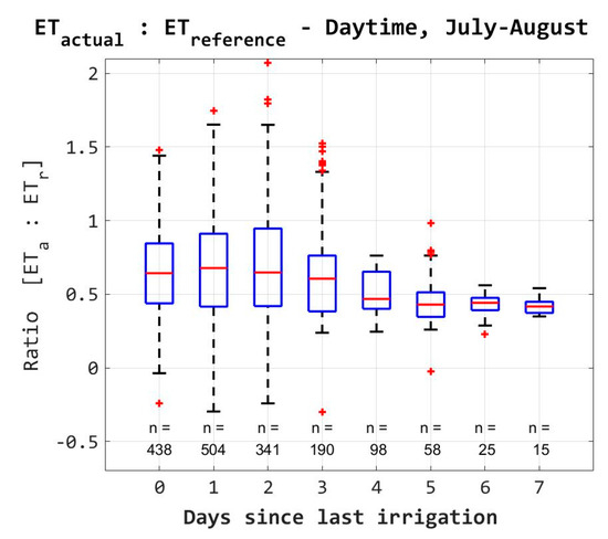 Average of ratio of 30-min ETa:ETref, grouped by the number of days since last irrigation (at site 1). Boxes indicate the 1st to 3rd quartile range (25th–75th percentile), with the median value indicated by the red line. Whiskers bound the most extreme values within ± 2.7σ, with outliers outside these bounds indicated by “+” markers.