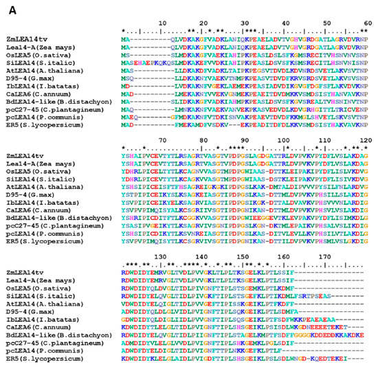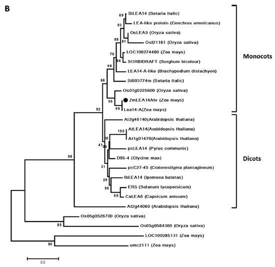 A putative LEA coding sequence from a native maize landrace Tevang 1 (Z. mays cv. Tevang 1) was isolated and named ZmLEA14tv. The isolated ZmLEA14tv had a size of 693 base pairs (bp) with an open reading frame of 459 bp in length encoding for a deduced 152 amino acid (aa) protein. Sequence analysis exhibited the highest similarity at 99% with a Z. mays LEA14A coding sequence (accession number NM_001159174), followed by LEA14A of Shorgum bicolor (XM_002454858.2) and LEA14A-like gene of S. italica (93% and 87%, respectively). The comparison with the reference sequence number NM_001159174 in GenBank showed two variations, G381A and C456T; however, the deduced amino acid sequence was not changed. The putative protein was predicted at 15.96 kDa in molecular weight with a pI of 6.08. The protein was rich in Val (12.6%), Leu (11.3%), and Gly (9.2%), but contained low quantities of Trp (0.7%), Asn (1.3%), Cys (0.7%), and Gln (1.3%). The GRAVY and instability index of the putative ZmLEA14tv were 0.047 and 16.01, respectively, suggesting stability and hydrophobic nature. A conserved “LEA_2” motif (PF03186), which was classified into subgroup 5C according to Battaglia’s classification of LEA proteins, was found on the ZmLEA14tv through an InterProScan search [11]. Further analysis showed that ZmLEA14tv contained a low percentage of polar amino acids (23.02%) and a high level of hydrophobic residues (47.02%). The ZmLEA14tv protein displayed diverse homology with other group 5C LEA proteins and broadly matches similar segments in related LEA proteins, indicating a close evolutionary relationship among these proteins (Figure 1A,B). The phylogenetic analysis also showed that the ZmLEA14tv protein has the closest relationship with maize LEA14A protein (accession number NM_001159174), followed by an LEA-like protein from rice, namely Os01g0225600 (accession number NM_001048996), supported by high bootstrap values (99% and 95%, respectively).