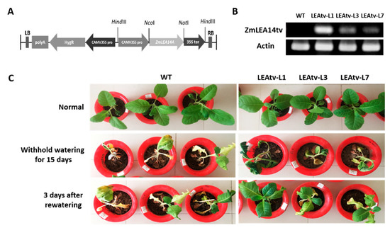 The expression of the ZmLEA14tv in tobacco (Nicotiana tabacum). (A) Schematic description of T-DNA involving in the pCAMBIA1300/ZmLEA14tv plasmid for the expression of ZmLEA14tv in plants. LB: left T-DNA border; RB: right T-DNA border; HygR: Hygromycin resistant gene; CaMV35S pro: Cauliflower mosaic virus 35S promoter; 35S ter: 35S terminator; ZmLEA14A: coding region of ZmLEA14tv gene; NcoI, NotI, and HindIII: restriction site of NcoI, NotI và HindIII, respectively. (B) RT-PCR analysis of ZmLEA14tv in transgenic tobacco lines (LEAtv-L1, LEAtv-L3, LEAtv-L7). WT: the wild type was used as a control. (C) The phenotype of transgenic and WT tobacco explants under normal and drought stress conditions.