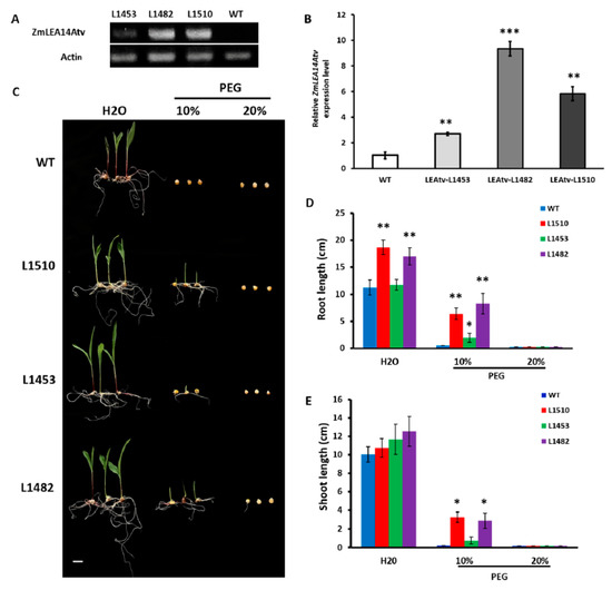 The expression of ZmLEA14tv in maize (Z. mays). (A,B) ZmLEA14tv expression in three lines of T2 transgenic maize (L1453, L1482, and L1510) determined by RT-PCR (A) and qRT-PCR (B). Data in (B) represent means and standard errors for three biological replicates. (C) The phenotype of transgenic and WT maize under various abiotic stress treatment during the germination stage. The T2 of transgenic seeds were soaked in water (as control) or in 10% PEG, 20% PEG solution for drought simulation for one day at 30 °C and then placed on filter paper in plastic boxes wetted with the same solutions mentioned above for eight days. Each experiment was replicated three times. (D,E) The root and shoot length of transgenic and wild-type maize germinated under control (H2O) and drought-simulating conditions (10% PEG and 20% PEG). Statistical significance was determined by Student’s t-test. * p < 0.05; ** p < 0.01.