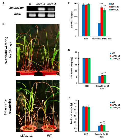 Furthermore, the drought tolerance of transgenic maize seedlings in soil was examined (Figure 4B–E). No significant differences in survival rate and fresh weight were observed between the transgenic and WT plants under well-wateredconditions (H2O). However, after drought stress for 14 days and re-watering, only 40% of WT seedlings could be restored, while this ratio in transgenic lines (LEAtv-L1 and LEAtv-L2) was almost doubled (87% and 80%, respectively) (Figure 4C). In addition, the fresh stem weight and fresh root weight of transgenic lines were significantly higher than the K7 wild type, suggesting a better growth rate of these lines in drought condition (Figure 4D,E). Taken together, these results indicate that the ZmLEA14tv gene showed improved drought resistance in transgenic maize.