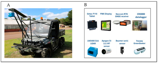 The ground-based phenotyping platform named as “Phenorover” assembled in Hamilton Centre, AVR for field phenotyping of perennial ryegrass. (A) Semiautomated ground vehicle named Phenorover; (B) list of deployed sensors on Phenorover.
