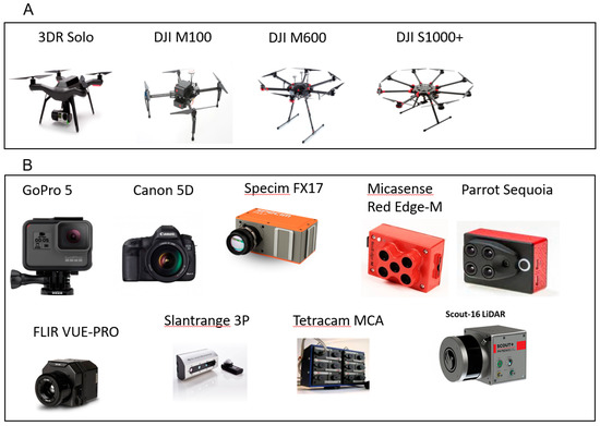 Aerial platforms may include various UAS types carrying different sensors, including digital cameras, multispectral imaging, hyperspectral imaging systems and LiDAR (Figure 3) (for detail on the integration of sensors to UASs see review in Tables 2 and 3 by [108] and [109], respectively). UASs have the potential to rapidly measure ground cover, plant height, biomass and leaf area index [110,111,112,113,114,115]. Another aerial platform that can perform phenotyping may include satellites, where they have the advantage of covering large areas at a time. However, satellites have mostly lower temporal and spatial resolution compared to UASs. It is also challenging to obtain satellite imagery at frequent time intervals without cloud interference. Furthermore, UASs have a lower cost of buying and deploying compared to the launching and buying of the high-resolution satellites [116]. UASs fly at a lower altitude than satellites (even < 100 m) allowing reasonable resolution and may cover large areas of measurement in limited timeframe compared to GB-HTP. UASs are affordable and available for repeated data collection without impacting the soil or plants [117,118].