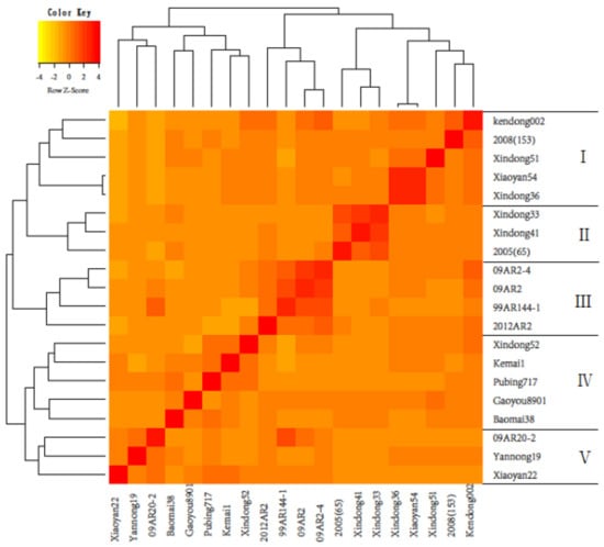 Among the 20 parents, the GD between Xiaoyan 54 and Xindong 36 was the smallest (0.008), the GD between Yannong 19 and Xindong 41 was the largest (0.276), and the GD between all parents consisted of a range from 0.008 to 0.276, with an average of 0.212. The GD between restorer lines consisted of range from 0.078 to 0.189 (Table 1). Based on cluster analysis, the 20 parents were divided into five main groups as follows: group I was the four restorer lines, Xinjiang local varieties (lines) were divided into group II and III according to cultivars (lines) origin, group IV was the new variety in the North China winter wheat region, and group V was the new variety (line) in the Huanghuai wheat region. The results showed that the grouping was almost consistent with the actual pedigree (Figure 1).