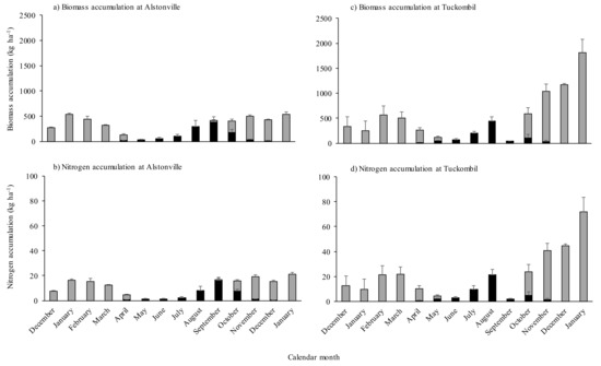 Pinto peanut and white clover biomass production at Alstonville (a) and Tuckombil (b), and nitrogen accumulation to Alstonville (c) and Tuckombil (d) in the 2015 calendar year. Grey shading indicates Pinto peanut and black shading indicates white clover. Error bars are SEM (n = 4).