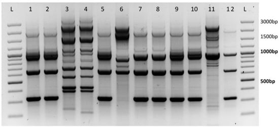 Determination of Leptosphaeria species. Banding patterns using PCR method with ERIC primers. Detected pathogens: Leptosphaeria maculans (lines 1,2,5,7–10,12), Leptosphaeria biglobosa (lines 3,4).