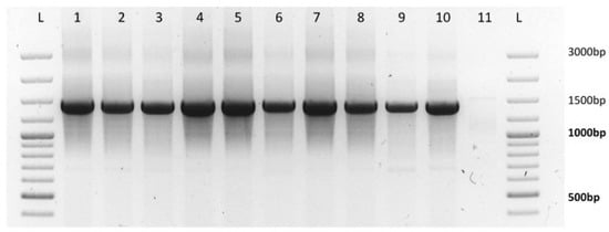 Molecular detections of phytoplasmas by PCR using primers for the highly conserved 16S rRNA gene using primers P1/P6. Lines 1–10: infected plants with phytoplasma symptoms, line 11: water control. L: ladder 100 bp plus (Thermo).