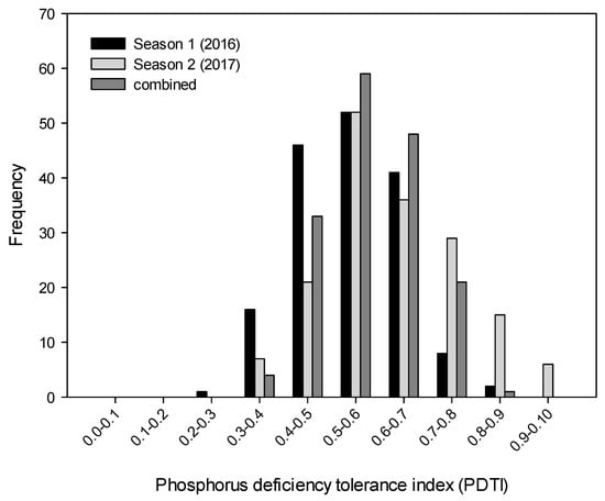 Frequency distribution of the phosphorus deficiency tolerance index (PDTI) of 168 Thai indigenous upland rice cultivars in Season 1, Season 2, and in combination.