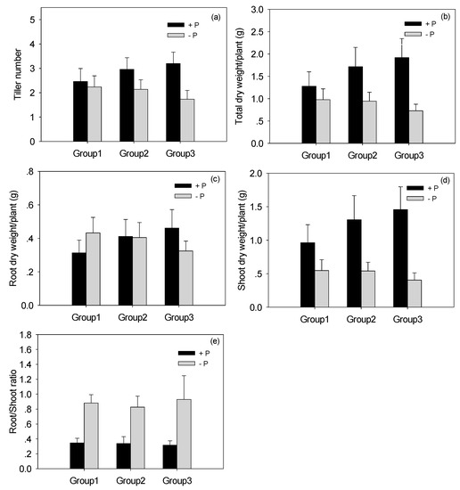 Mean and standard deviation of five traits related to Phosphorus deficiency tolerance index (PDTI) in three genotypic groups under +P and −P. Groups 1, 2, and 3 represent high, moderate, and low tolerances under phosphorus deficiency. Number of rice accessions in Groups 1, 2, and 3 are 22, 107, and 37, respectively. (a) the tiller number under +P and −P of three genotypes groups, (b) total dry weight per plant of three genotypes group under +P and −P, (c) the root dry weight per plant of three genotypes groups under +P and −P, (d) the shoot dry weight of each genotypes group under +P and −P and (e) is the root/shoot ratio of each genotypes groups under +P and −P.