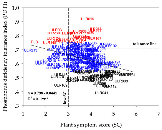The relationship between plant symptom score (SC) and phosphorus deficiency tolerance index (PDTI) of 168 indigenous upland rice genotypes; red = Group 1, blue = Group 2, and black = Group 3.