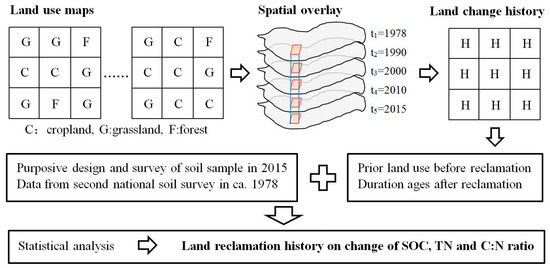 Figure 2 showed the framework for exploring how land reclamation history influences the soil properties. Using the land use maps at different time nodes and spatial overlaying techniques, the land change histories at each location were identified from ca. 1978 to 2015. Also, the specific land reclamation history, including the prior land use before the reclamation and the duration age after the reclamation were extracted. Meanwhile, the simultaneous changes of SOC, TN, and C:N ratio were collected by purposive survey sampling in 2015 and the soil dataset in ca. 1978. Based on the statistical test, the impact of land reclamation history on SOC, TN, and the C:N ratio can be analyzed.