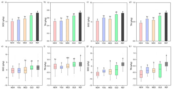 Impact of reclamation ages on soil C and N: (a) Soil organic carbon content in 2015 assarted from grassland, (b) Total nitrogen content in 2015 assarted from grassland, (c) Soil organic carbon content in 2015 assarted from forest, (d) Total nitrogen content in 2015 assarted from forest, (e) Change of soil organic carbon content assarted from grassland, (f) Change of total nitrogen content assarted from grassland, (g) Change of soil organic carbon content assarted from forest, (h) Change of total nitrogen content assarted from forest. NEW = newly assarted (1–5 years), YOU = young assarted (6–15 years), MED = medium assarted (16–25 years), OLD = old assarted (26–37 years), REF = referenced cropland assarted before 1978.