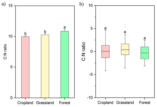 Moreover, as the age of cultivated soils increased, the different accumulation rates of C and N in the soils resulted in a change of C:N ratio [79]. With increasing reclamation age, it was found that the increases in C:N ratios for sites previously used as grassland tended to be less (Figure 7c). The increased N accumulation in the soil may be partly due to the overuse of N fertilizer, an effective way to increase crop biomass and yield, enhancing the N deposition in soils [80]. An experimental site receiving synthetic N fertilization over a 40–50 year period indicated a net decline in soil C [81]. Thus, the C:N ratio decreased according to the smaller change rate of SOC accumulation than N deposition. In addition, C:N ratios from previously forested land stayed relatively stable, indicating similar accumulation rates and a relative balance between SOC and TN. The variations in soil C:N ratio are not only caused by C and N inputs, but also by decomposition in soils [11]. Soil micro-organisms in the previously forested soils may enhance nitrogen-induced increases in the C uptake in the soil [82]. The underlying mechanisms of these variations and the longer time monitoring of C:N ratios require further study.