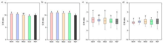Impact of reclamation ages on soil C:N ratio: (a) Values in 2015 assarted from grassland, (b) values in 2015 assarted from forest, (c) Changes assarted from grassland, (d) Changes assarted from forest. NEW = newly assarted (1–5 years), YOU = young assarted (6–15 years), MED = medium assarted (16–25 years), OLD = old assarted (26–37 years), REF = referenced cropland assarted before 1978. NEW = newly assarted (1–5 years), YOU = young assarted (6–15 years), MED = medium assarted (16–25 years), OLD = old assarted (26–37 years), REF = referenced cropland assarted before 1978.