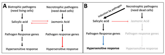 Salicylic acid and jasmonic acid pathways react to different types of pathogens. (A) The plant responds to biotrophic pathogens via the SA pathway, inducing SA-specific pathogen response genes, resulting in hypersensitive responses that inhibit the spread of the pathogens. The response to necrotrophic pathogens occurs via the JA pathway, inducing JA-specific pathogen response genes that block the hypersensitive response. (B) Certain necrotrophic fungi actively induce the SA pathway to elicit the hypersensitive response and feed on the dead cells, while they also block the JA pathway.