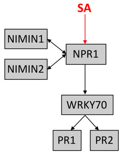 Salicylic acid (SA) pathway. SA induces the expression and transfer to the nucleus of NPR1, where it interacts with the kinases NIMIN1&2 in a complex to trigger WRKY70. This transcription factor is responsible for the transcription of pathway-specific pathogen resistance genes, such as PR1 and PR2.