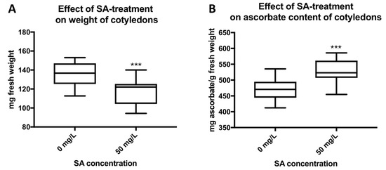 Weight loss (A) and increase of ascorbate concentration per fresh weight (B) in cotyledons of 12-day-old seedlings of the control line treated for 16 h with 50 mg/L SA. 45 cotyledons derived from 45 seedlings were used per condition. Statistical significance versus control using unpaired t-test (GraphPad Prism version 7.00 for OS X, GraphPad Software, La Jolla California USA, www.graphpad.com): *** p < 0.001.