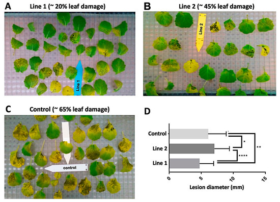 In spot assays on cotyledons, the lesion diameter was compared to that of the control. Line 1 was found to be significantly more tolerant to Botrytis cinerea, but not Line 2 that showed an even slightly increased susceptibility to Botrytis cinerea when compared to the control line (Figure 4D).