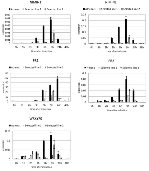 To understand the mechanism of the SA-tolerance, the expression of the genes of the SA pathway were studied in the control and the selected Lines 1 and 2, after induction by SA. The genes of the SA pathway are expressed transiently and at different time points after induction by SA, for this the transcription of the genes of the SA pathway were studied in time series after induction with SA for 0, 2, 3, 6, 9, 24, and 48 h. The genes studied were NIMIN1, NIMIN2, WRKY70, PR1, and PR2. Because NPR1 is regulated post-translationally [4,27] the transcription of NPR1 was not studied. When the transient expression of the SA response genes was checked by means of RT-qPCR, a strong transient induction was found in all tested previously reported genes, namely PR1, PR2, WRKY70, NIMIN1, and NIMIN2 that all reached a maximum after six to nine hours post induction (Figure 5). This expression was mostly lost within 48 h (Figure 5). In the selected populations, the genes were still induced, but at a much lower rate, with over 10-fold reduction in relative expression increase, indicating the holistic suppression without the loss of the pathway.