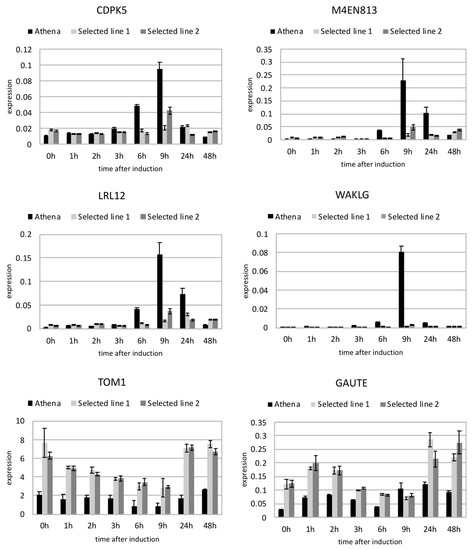 Additionally, RNA-seq was used to identify genes, that after induction by SA, show the same abolished induction pattern as the known genes of the SA pathway. Two genes associated with the ABA pathway and dehydration were found. The ABA pathway has been reported to have some connections to the SA pathway [28,29]. Interestingly, one gene was identified that is involved in pollen development (GAUTE). This gene has a unique expression pattern, but its induction was clearly reduced in the selected lines. Only one predicted gene activated by SA stimulus (M4E813) has been computer annotated and, although it has been associated with a general response to stress (UniProt: M4E813_BRARP), including both biotic and abiotic stresses (GO:0006950), structural annotations range from the Usp domain-containing (InterPro: M4E813_BRARP) to the U-box proteins (Genebank XM_013841965.2). All the newly identified genes could be further investigated for possible involvement in SA signaling.
