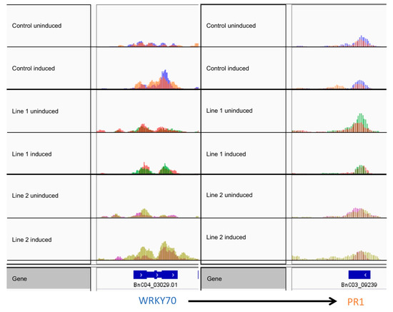 After induction by SA the overall H3K4me3 changes were subtler than the Pol2 distributions, often showing a mark elongation from the transcriptional start to the entire gene. Only in genes high in the cascade, such as WRKY70 and NPR3, the H3K4me3 deposition increased 6 h post induction, but in genes at the end of the induction cascade, such as PR1, the epigenetic mark did not change. Interestingly, the amounts of H3K4me3 deposition were lower in the selected Line 1 than those in the control (Figure 7). This selected Line 1 showed also a greater decrease in transcription and had a significantly higher tolerance to Botrytis cinerea than the control.
