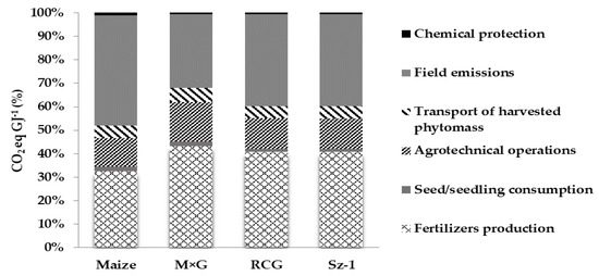 The results of the five-year growth of maize, RCG, Sz-1, and M × G for energy-generating purposes are summarized in this paper. According to the methodology applied and data gathered during the study period (dry matter yield rate, inputs and outputs of cycle of growth), the life cycles (from pre-seeding soil preparation to harvest, transport, and silage of the harvested material) of the above-mentioned crops were determined, and the environmental impacts were calculated. As mentioned above, the results of this research are related to the impact category of “climate change”, which is expressed in carbon dioxide equivalents (CO2 eq = 1 × CO2; 2 × CH4; 298 × N2O). The metric is based on the efficiencies of greenhouse gases [34,35]. The potential impact of N2O and CH4 emissions (they are produced by crops grown on arable land) on global warming (one-hundred-year interval) is 298 times and 23 times higher than the potential impact of carbon dioxide [36].