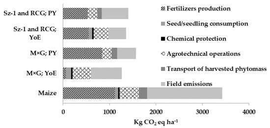 Figure 2 shows the major differences in greenhouse gas production per area unit (1 ha) between maize, RCG, Sz-1, and M × G. To incorporate the unique farming technology used for maize into the assessment, any differences between greenhouse gases produced per area unit each year (in accordance with the methodology) were determined. As various farming technologies were employed, the environmental burden of perennial agriculture related to an area unit was divided into several years of establishment (of the crop stand) (YoE) and productive years (PY). The figures in Graph 2 show that conventional maize produces the most emissions per area unit (3422.50 kg of CO2 eq GJ−1). Considering the perennial character of the other crops, models of the environmental burden per area unit were divided into YoE and PY. An area emission burden of 1266.2 kg of CO2 eq GJ−1 in YoE and 1567.7 kg of CO2 eq GJ−1 in PY was quantified for the M × G crop stand establishment in this research. An emission burden of 1358.5 kg of CO2 eq GJ−1 in YoE and 1406.1 kg of CO2 eq GJ-1 in PY was quantified for the Sz-1 and RCG crop stand establishments. Field emissions are the most significant type of emission: during the first four years of our research, maize produced about 1611.9 kg of CO2 eq ha−1 per year, and the perennial crops produced about 384.4–666.9 kg of CO2 eq ha−1 per year, depending on the employed technology. Recalculated to carbon dioxide eq, it reflects the findings of [66,82,83] on clover grasses. Maize imposes a much higher environmental burden than the other tested crops. The environmental burden of maize per area unit is, nevertheless, comparable to the other crops. Generally speaking, and from the point of view of emission burden per area unit, growing perennial crops (Sz-1, RCG, and M × G) is more environmentally-friendly than growing maize. Some other authors have also confirmed this fact, e.g., [46,84]. These crops also provided an adequate yield that is comparable to maize (seen on the long-time horizon).