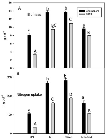 Plant aboveground biomass (A) and N uptake (B) at harvest. Error bars are standard deviation (n = 3). 0N: no Nitrogen; N: N fertilizer; N fertilizer with zeolite without sorption; N sorbed to zeolite. Letters show which treatments are significantly different for sandy soil (capital letters) and chernozem (small letters).