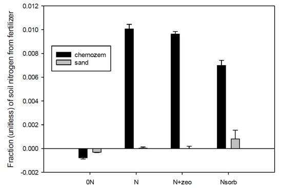 Some of the N from fertilizer was found in the chernozem at the end of the experiment, whilst this was negligible in the sandy soil. This may indicate that soils rich in organic matter have faster nutrient cycling and may therefore be better able to supply the plant with nutrients when it needs it, as well as taking N up in microbial biomass [35]. The sandy soil depends more on added N and it cannot be retained in the soil. The fact that some of the sorbed N from fertilizer was found also in the sandy soil at the end of the experiment but not in the other treatments further supported the conclusion that some of the N added sorbed was unavailable to plants in the studied early periods. In the chernozem, the lower uptake of sorbed N was not compensated by higher retention in soil and this may indicate that gaseous losses may have been higher in this soil. The chernozem has both higher organic matter content and somewhat higher pH than the sandy soil, both of which promote microbial activity and nitrification. The addition of zeolite to the soil could have effect on microbial biomass and activity. He et al. [36] found only a small effect when only zeolite was added, but a large effect when also a carbon source (cellulose) was added, supporting that there is an interaction between carbon content and zeolite effect on microbial growth.