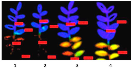 Chlorophyll fluorescence imaging helps to dissect the genetics of photosynthesis at the different levels of both plant physiology and development [93]. Therefore, it has been used as an effective screening tool for stress tolerance, as in strawberry, mungbean, cotton, peanut and chickpea (Figure 2). Due to the simplicity and effectiveness of measuring this trait, it is now being applied successfully for different environmental stresses, and an excellent review is available on this technique (Yadav et al. [94]).