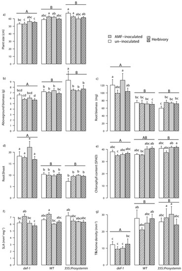 Tomato plants growth and defense traits (mean + standard error (SE)), including (a) plant size (n = 102), (b) plant biomass (n = 100), (c) roots biomass (n = 65), (d) roots:shoots ratio (n = 65), (e) chlorophyll content (n = 103), (f) specific leaf area (SLA; n = 66), (g) and trichome density (n = 66). The plants have different genotype: jasmonic acid (JA) expression deficient plants (def-1), wild-type plants (WT), and prosystemin constitutive expression (35S::prosystemin) plants. Traits were measured after eight weeks of growth. Half of the plants were either inoculated with Arbuscular mycorrhizal fungi (AMF) (grey bars) or left un-inoculated (white bars). Dashed line bars represent plants treated with S. littoralis for 7 d. Lower case letters above bars represent pairwise significant difference across all treatments’ combination after Tukey’s mean separation test (p < 0.05). Capital letters above bars represent difference across tomato genotypes.
