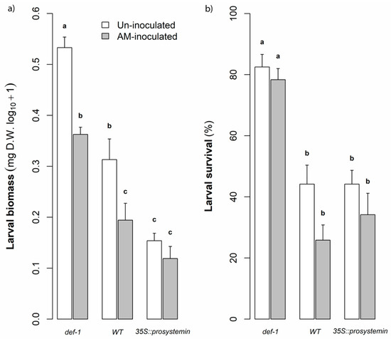 Effect of plant type and AM fungi treatment (mean + SE, n = 12) on (a) larval biomass (mg D.W., log10 + 1) and (b) larval survival (%). Grey solids and dotted black lines represent AM-inoculated and un-inoculated plant respectively. Plant type: JA expression deficient plants (def-1), wild-type plants (WT) and prosystemin constitutive expression plants (35S::prosystemin). Larvae were placed on plants after seven weeks of growth and larval biomass and mortality were measured after one week of feeding on plants. Letters above the bars indicate significant difference according to Tukey’s mean separation test (p < 0.05).
