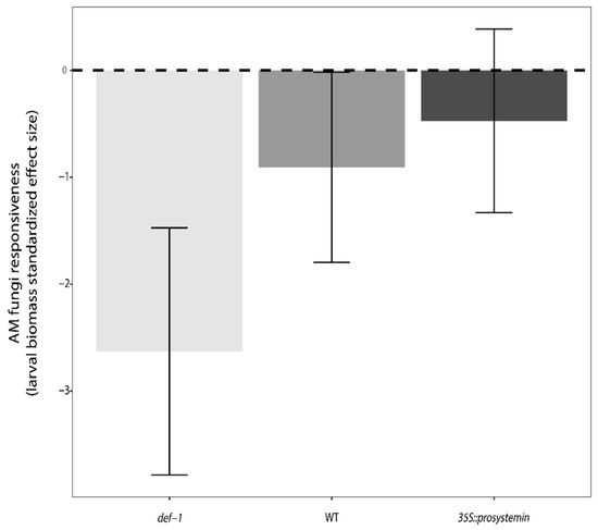 AM fungi responsiveness measure of the three plant type: JA expression deficient plants (def-1), wild-type plants (WT), and prosystemin constitutive expression plants (35S::prosystemin). Different colors represent the three different genotype. Effect size were based on the average larval biomass (n = 12). Negative standardized effect size indicate that larval biomass negatively responded to AM fungi presence in plant roots.
