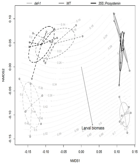 Non-metric multidimensional scaling (NDMS) ordination of different tomato plant type colonized or not by AM fungi on plant functional traits. Larval biomass of S. littoralis feeding on different plant treatments is overlaid as response curves in grey. Treatments are enclosed by ovals according to plant type: JA expression deficient plants (def-1), wild-type plants (WT), and prosystemin constitutive expression plants (35S::prosystemin) coloured in light grey, dark grey, and black, respectively, and AM fungi treatment dotted ovals for AM-inoculated plant and solid line for un-inoculated plants. n = 35.
