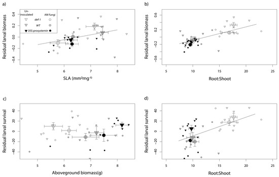 Effect of plant growth and defensive traits on S. littoralis caterpillar performance. Seven plant traits were included in the analysis but only the significant predictors following stepAIC selection are illustrated: (a) SLA and (b) root:shoot to explain larval biomass and (c) aboveground biomass and (d) root:shoot to explain larval survival. Residual larval biomass and larval survival refers to the statistical model with the other factor in the analysis. Larger points represent mean ± SE. The plants have different genotype shown with different colors: JA expression deficient plants (def-1) in white, wild-tape plants (WT) in grey, and JA over-accumulating plants (35S::prosystemin) in black. Different geometrical figures represent AM-fungal treatment: triangles represent un-inoculated plants and circles AM-inoculated plants (n = 36).