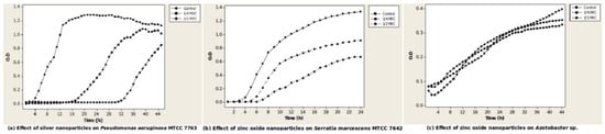 Inhibition of growth to an extent of 50% was seen in Sinorhizobium meliloti clsxc_S_SNF, Arthrobacter sp. MTCC 8160, Bacillus sp. clsxc_NPS, Bacillus subtilis MTCC 441, Pantoea dispersa clsxc_PSD, and Serratia marcescens MTCC 7642 (Figure 1b) when exposed to ZnO nanoparticles. Most cultures showed some inhibition on exposure to Ag nanoparticles. Two cultures, Rhizobium leguminosarum MTCC 10096 and Azotobacter chroococcum clsxc_A-FLNF (Figure 1c), when exposed to ZnO nanoparticles, showed growth response similar to control. Growth response of all isolates to concentrations of Ag and ZnO nanoparticles that were sub-MIC is included in the Supplementary Materials, Figure S3.