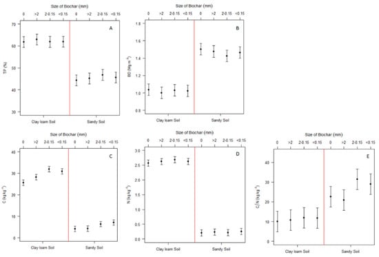 The high bulk density in sandy soil and low bulk density in loamy soil can be attributed to the soil particle. For both soils, porosity and bulk density are inversely proportional to each other. There was no significant effect (p > 0.05) of biochar particle size on soil bulk density (Figure 1B). However, in sandy soil, there is a tendency for reduction of the bulk density with reduction of the particle size until the 2–0.15 mm fraction in loamy soil increases in the bulk density with the decrease of particle size.