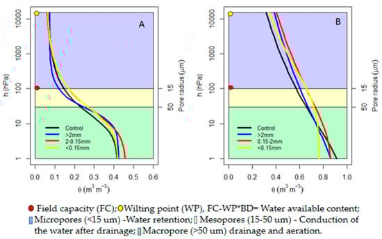 According to a Shapiro–Wilk normality test at 5% of significance, there is no significant difference between the treatments (Figure 2) in clay loam and sandy soil. Comparing the addition of 25 Mg ha−1 of biochar with the control treatment (only soil), the biochar addition did not promote an increase in water retention in sandy soil. Although the effect of particle size on water retention properties was very low when the particle size decreased (<0.15 mm), the water retention increased in moderate (100 hPa) and in dry conditions (15000 hPa); the range of these conditions represents the variation between mesopores and micropores, respectively (Figure 2A). Similarly, in their experiment on sandy soil, Jeffery et al. [47] did not find significant effects of biochar application on soil water retention. Similar results were observed by Hardie et al. [48] with no improvement in soil moisture and water retention characteristics.