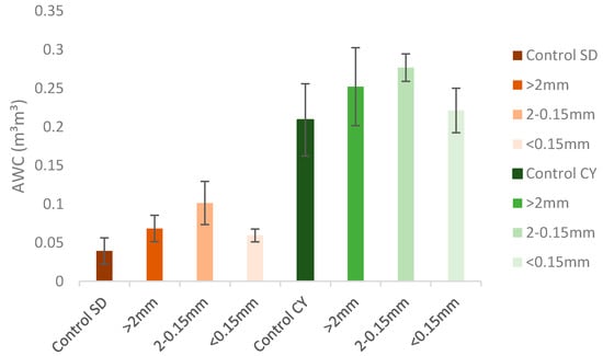 A significant difference in the plant-available water content (AWC) was found for the soil textures. In all treatments, the loamy had more AWC than the sandy soil. For both soils, we found a significant effect of biochar addition on AWC (p < 0.05), and between biochar fractions the best treatment was 2–0.15 mm; this treatment differed from <0.15 mm and the control treatment. (Figure 3).