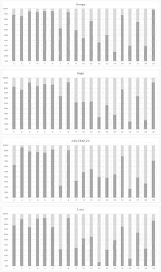 There were significant differences in the content of ∑MUFA and ∑PUFA in the CSS-CAM 25 (PI 650154) genotype, which had the lowest content of ∑MUFA and the highest content of ∑PUFA. The ω-6/ω-3 ratio in all the genotypes was about 1:2. This is characteristic of camelina oil [5], which is a good source of ω-3 acids (ALA). The camelina genotypes contained 35% (Hoga) to 46% (CSS-CAM 25) of α-linoleic acid. The content of α-linoleic acid amounted to less than 1% in olive and sunflower oils, about 8% in rapeseed and soybean oils, 10.4% in walnut oil, and up to 60% in linseed [23,29,30]. It is very important to enrich the diet with products containing large amounts of ω-3 acids, especially due to the fact that many vegetable oils (sunflower oil, saffron oil, cottonseed oil, soybean oil) contain large amounts of ω-6 acids [6].