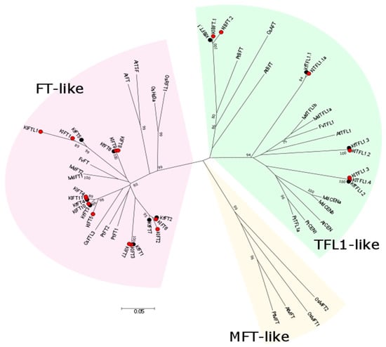 The unrooted neighbor-joining phylogenetic tree was constructed using predicted amino acid protein sequences from Kalanchoë and six other species in which functional assessment of FT and TFL1 functions was confirmed by transgenic approach [4,15,48] (Figure 1).