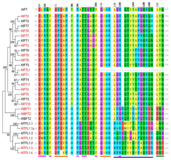 It has been demonstrated in A. thaliana that FT and TFL1 may have an interchangeable roles by replacing a single amino acid [7] or protein segment [8,16] (Figure 2). Differences in FT/TFL1-like protein activities might be due to their binding affinity towards FD and/or 14-3-3 proteins. In the Kalanchoë PEBP protein alignment, we identified four amino acids, i.e., R62, P94, F101, and R130, predicted to participate in binding of 14-3-3 proteins [9,21]. Amino acid alignment revealed that Kalanchoë FT-like proteins had conserved tyrosine at position 85 (Y85) characteristic for floral promoters, while TFL1-like proteins had conserved histidine at position 85 (H85) characteristic for floral repressors [7]. Generally, FT-like proteins contain a region called segment B, which forms a loop in the protein structure and is essential for FT-like proteins to function as floral promoters. FT-like proteins usually contain tyrosine at position 134 (Y134) and tryptophan at position 138 (W138) in segment B, whereas the flowering repressor proteins contain non-tyrosine and non-tryptophan amino acids in these positions, respectively [4,8,49]. Additionally, FT-like proteins contain a triad region—Segment C—that is required for full functionality of FT-like proteins but not TFL1-like proteins [4,8]. Therefore, the presence of the mentioned residues indicates that Kalanchoë FT-like can act as flower activators and TFL1/BFT-like as flower repressors.