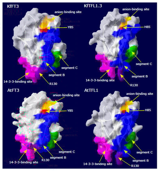 Predicted structure of KfFT3 and KfTFL1.3 in comparison to AtFT (A. thaliana 1wkpA) and AtTFL1 (A. thaliana 1wkoA) proteins [8]. The external loop segment B is represented in blue, segment C (XYN triad) in green, putative 14-3-3-binding site in pink, and anion binding site in orange color. The conserved Y85/H85 residue crucial for FT/TFL1 antagonistic activities are shown in red. The conserved R130 residue of segment B important for 14-3-3 binding activity is represented in violet.