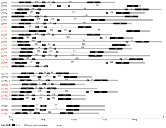 The length of the coding regions of PEBP-like genes in Kalanchoë ranged from 339 to 612 bp, with an average of 526 bp (FT-like: 531 bp; TFL1-like: 518 bp; BFT-like: 532 bp). All the genes of Kalanchoë were predicted to encode one transcript, except KlFTL1.1, that had two transcripts (Figure 4). Analysis of intron–exon distribution revealed that both FT-like and TFL1-like genes conserved the characteristic genomic organization for the gene family, with four exons and three introns, except KlFTL1 and KlFTL1.1b (secondary transcript of the gene). The length of the first exon in FT-like was between 198 and 285 bp (average: 211 bp, median: 207). The second and third exons were highly conserved with the length of 41 and 62 bp, respectively, except from KlFTL1, which had third exon of 64 bp. The fourth exon in FT-like group was between 224 and 236 bp (average: 228 bp and median: 230). The TFL1-like genes had a first exon between 198 and 216 bp (average: 207 bp, median 204 bp). Similarly, to FT-like genes, the second and third exons were highly conserved with 62 and 41 bp, respectively, except the KlFTL1.1 gene (KlFTL1.1b), which had a third exon of 160 bp. The fourth exon in TFL1-like group was 221 bp in all the genes. All three BFT-like genes were characterized by structures comprising three exons and two introns. The first exon was 207 or 210 bp, while second and third exons were 103 and 221 bp, respectively, in all the genes.