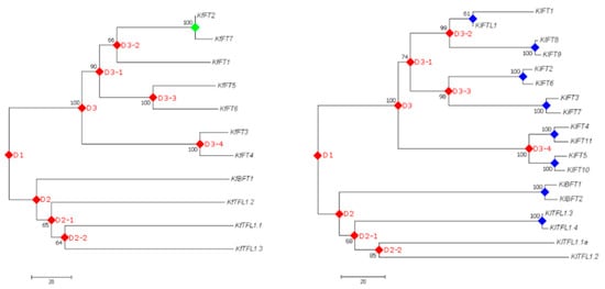 The length of the proteins ranged from 112 to 203 aa (average: 176 aa; median: 177 aa) in FT-like proteins and 145 to 179 aa (average: 172 aa; median: 175 aa) in TFL1-like proteins. The BFT-like proteins were either 176 or 177 aa. All identified proteins were characterized by a conserved PEBP domain. Domain analysis of primary transcript results from the CDD database confirmed the presence of the PEBP domain in the N-terminal regions of these proteins, except for KlFTL1 that contained only a partial PEBP domain. The multiple alignment of domain sequences followed by phylogenetic analysis confirmed the presence of three protein groups corresponding to FT-like, TFL1-like, and BFT-like proteins (Figure 2).
