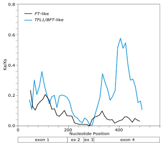 To further evaluate the sequence diversity in FT and TFL1 homologs, we performed a sliding window analysis of rates of pairwise nonsynonymous (Ka) and synonymous (Ks) substitutions (Figure 6). While exon 4 of the FT proteins had almost no amino acid substitutions indicating strong purifying selection, exon 4 of TFL1 had higher Ka/Ks ratio, suggesting more relaxed selection.