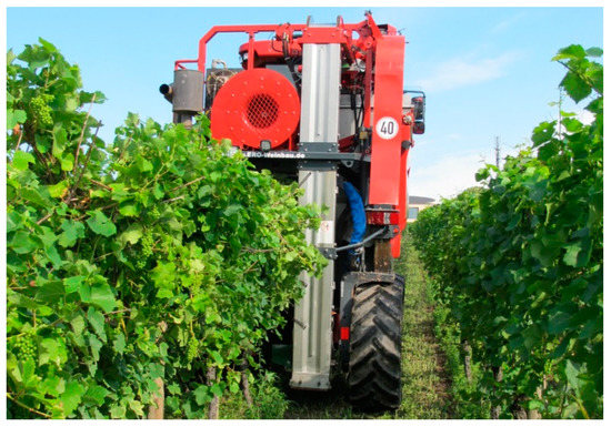 Mechanical thinning in the SMPH MT 1 and SMPH MT 2 treatments was conducted every year in the phenophase BBCH (Biologische Bundesanstalt, Bundessortenamt und CHemische Industrie) 79 [7], representing the time period between the day of reaching BBCH 79 and the day before reaching BBCH 81. Mechanical thinning dates were 9 August 2013, 23 July 2014, 30 July 2015, 16 August 2016, 20 July 2017, and 23 July 2018. Mechanical thinning was carried out using a grape harvester with a beater amplitude of 320 beats per minute (SMPH MT 1) or 370 beats per minute (SMPH MT 2), respectively. The harvest machine (Grapeliner® 6000, ERO-Gerätebau GMBH, Simmern, Germany) was equipped with six shaker pairs at altitudes of approximately 0.6 to 2.4 m from the ground (Figure 1).