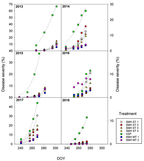 Progress of the disease severity of Botrytis cinerea in the different treatments between 2013 and 2018 as functions of the assessment date (day of the year (DOY)). Plot symbols represent the observed disease severities, with lines showing the calculated progress according to the sigmoidal equation type y = 100/(1 + e−((x−x0)/b)). SMPH, semi-minimal pruned hedge; ST, shoot topping; VSP, vertical shoot positioning; MT, mechanical thinning.