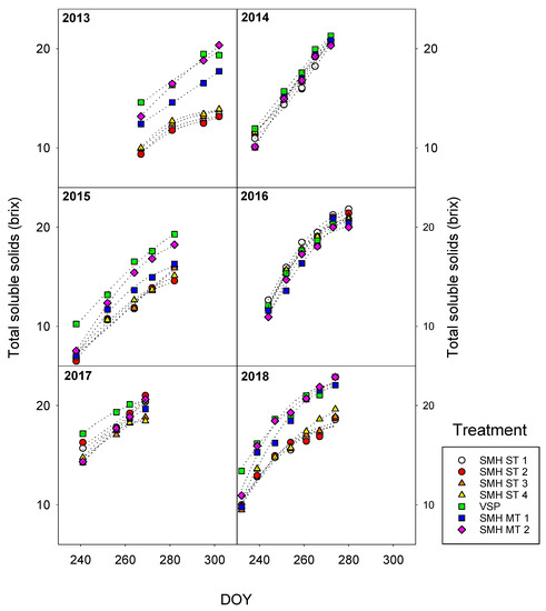 Progress of the total soluble solids in the different treatments between 2013 and 2018 as functions of the assessment date (DOY). Plot symbols represent the observed disease severities, with lines showing the calculated progress according to the sigmoidal equation type y = a/(1 + e−((x−x0)/b)). SMPH, semi-minimal pruned hedge; ST, shoot topping; VSP, vertical shoot positioning; MT, mechanical thinning.